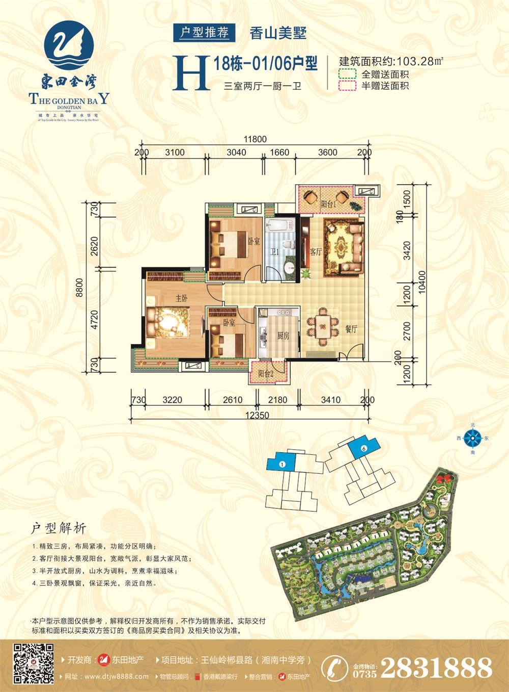 该户型分布在18栋的外侧,为103.28㎡三室两厅一厨一卫。该户型布局紧凑,功能分区明确;三个卧室都带有景观飘窗,保证通风采光,其他空间尺寸也比较充足,舒适度较高。