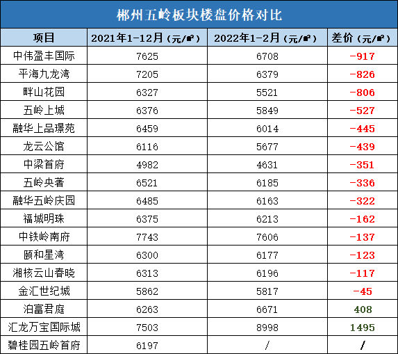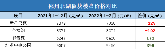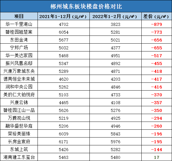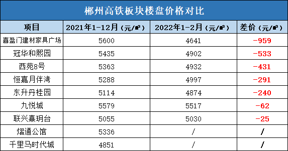 南塔板块靠近五岭广场,郴州两大城市主动脉:青年大道、国庆南路交汇于此,地理位置优越,在售项目并不多,本次春节期间价格降幅较小,没有差价超过300元/㎡的项目。