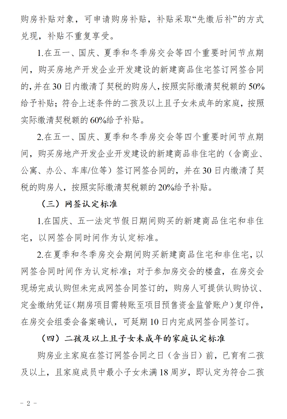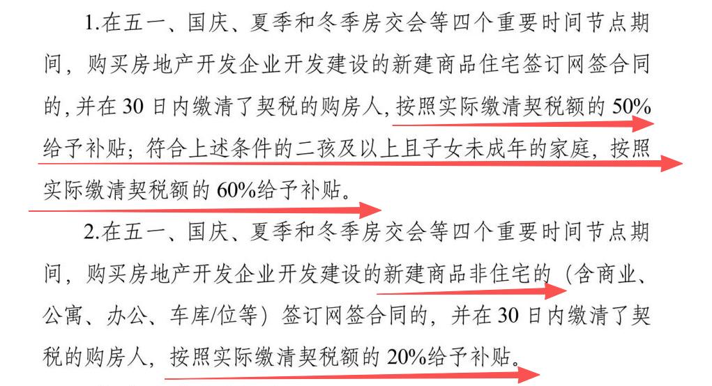 ◆购买新建商品住宅:普通家庭,可享50%契税补贴;二孩及以上且子女未成年的家庭,可享60%契税补贴。