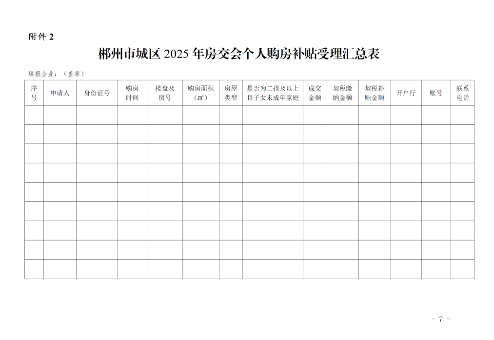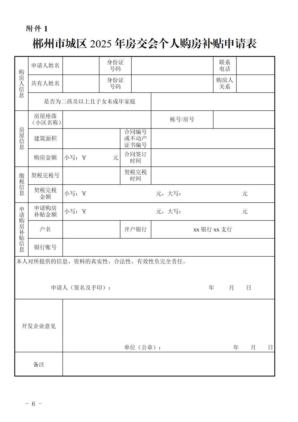1.郴州市城区2025年房交会个人购房补贴申请表;2.新建商品房买卖网签合同复印件(首页、1-4页及签字盖章页)或新建商品房项目地下车位(库)买卖合同复印件;
