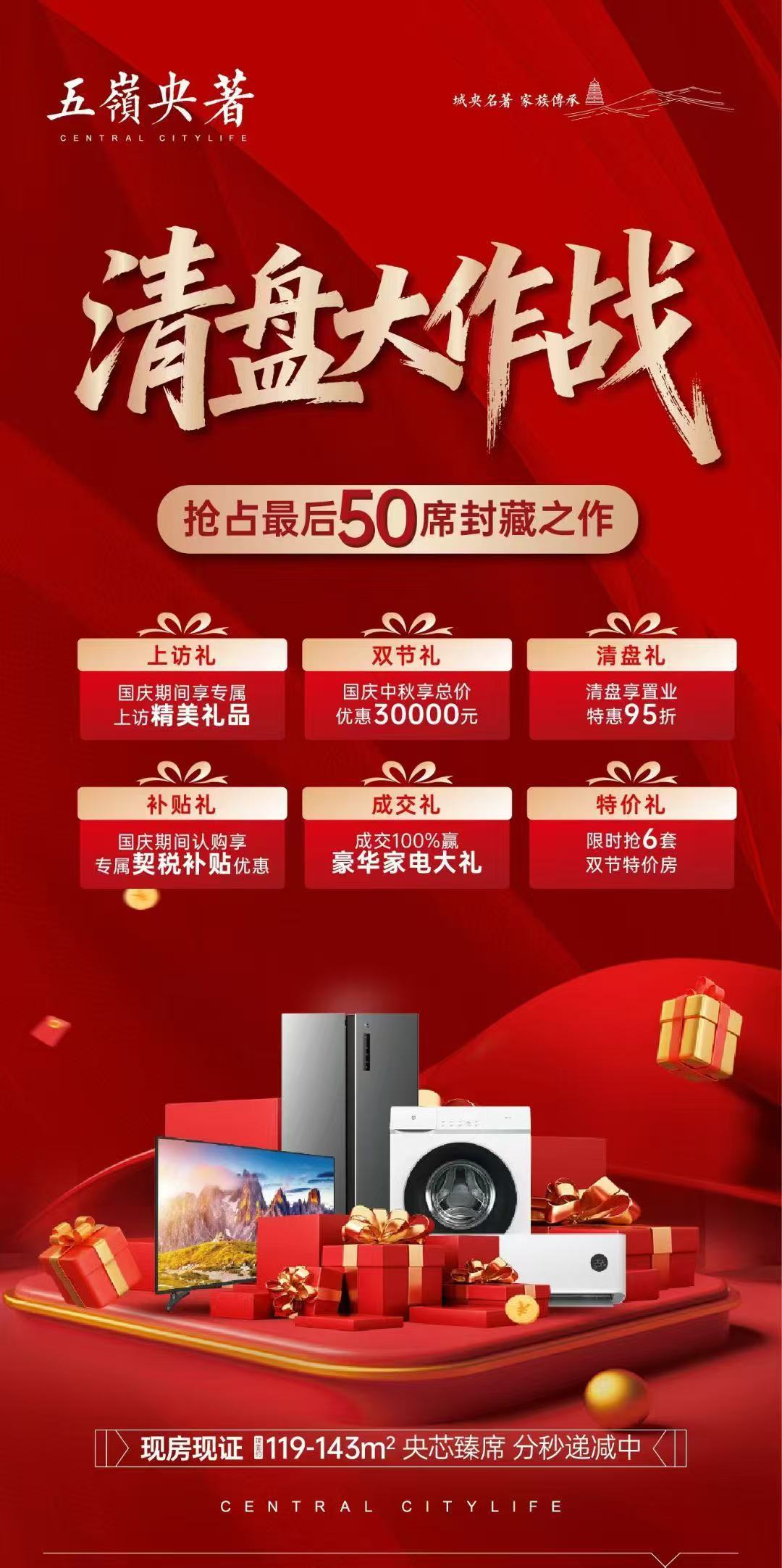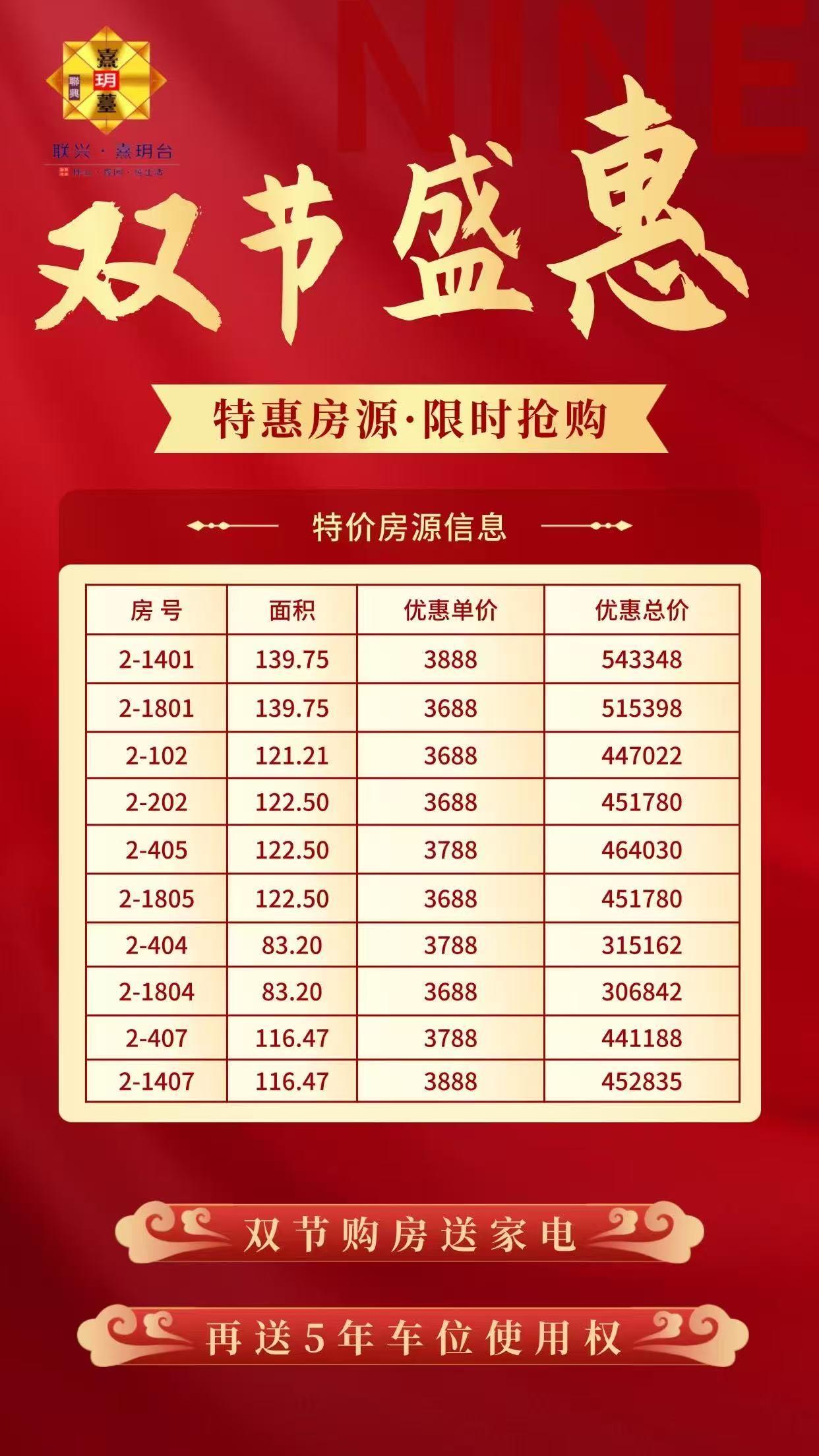 优惠政策:1.10套一口价房源,3688元/㎡起;2.双节购房送家电,再送5年车位使用权。
