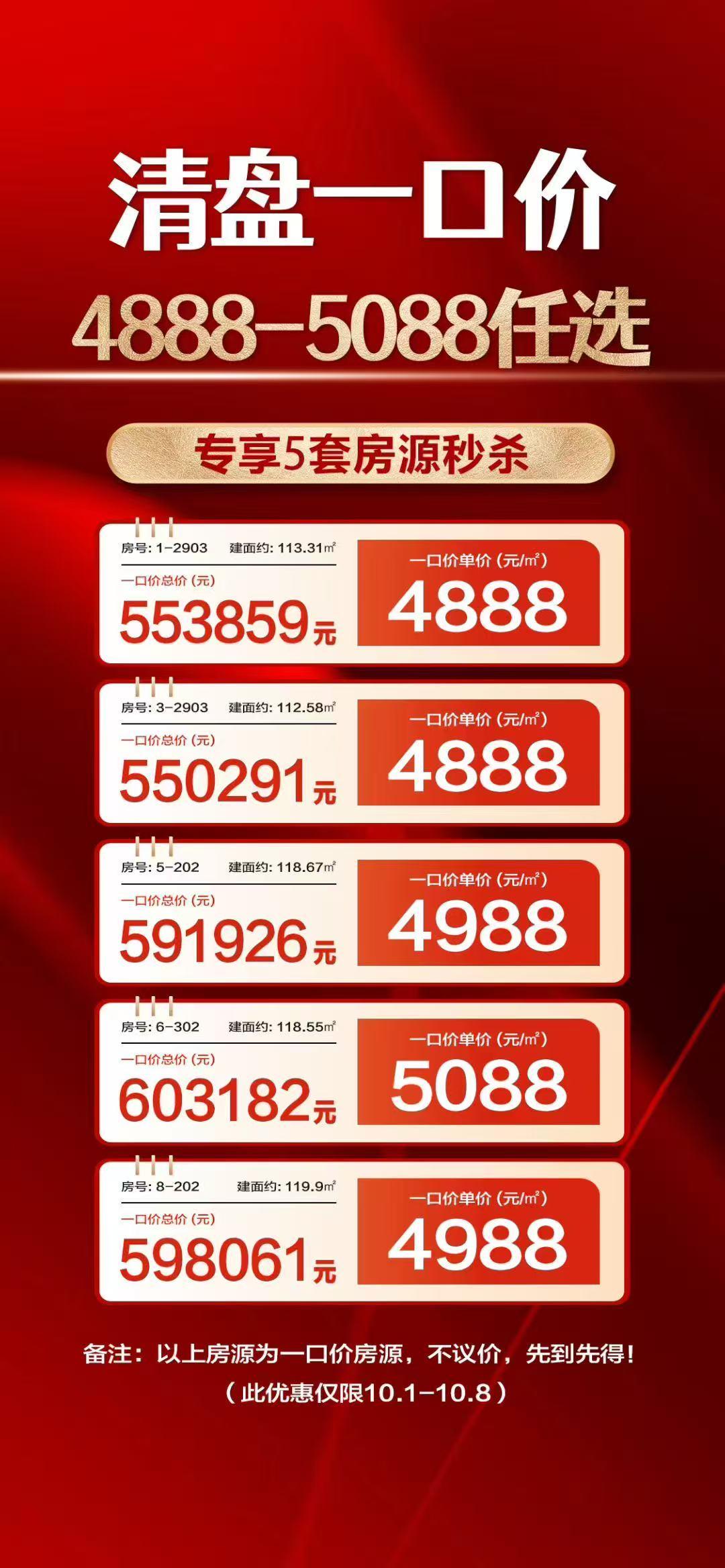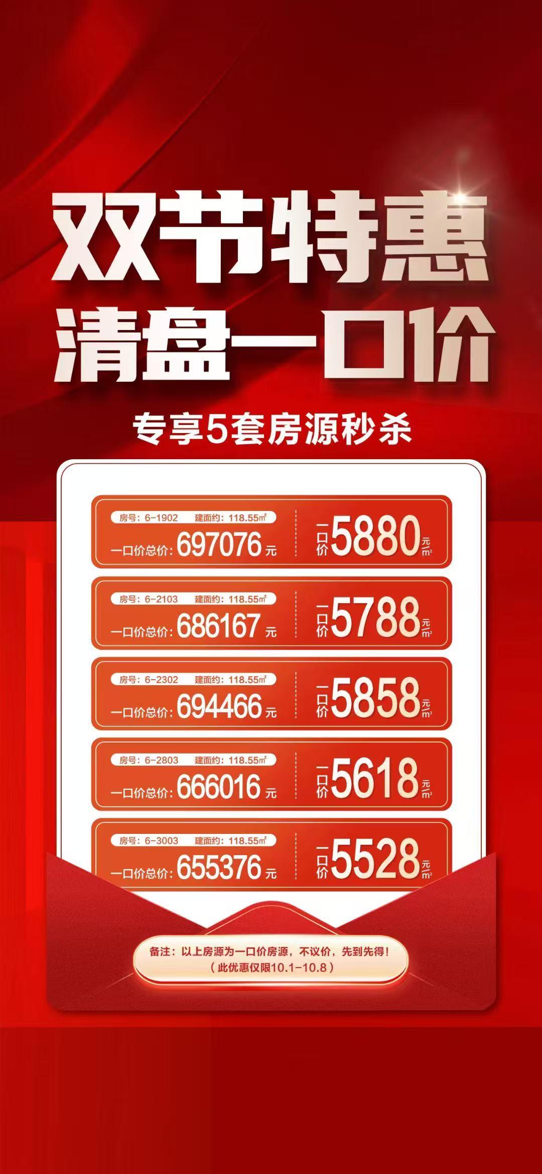 优惠政策:1.上门客户抽现金红包;2.看房客户可领取礼品一份;3.成交送礼品一份;4.双节额外98折(一口价房源除外)5.6一口价房源,4888元/㎡起。