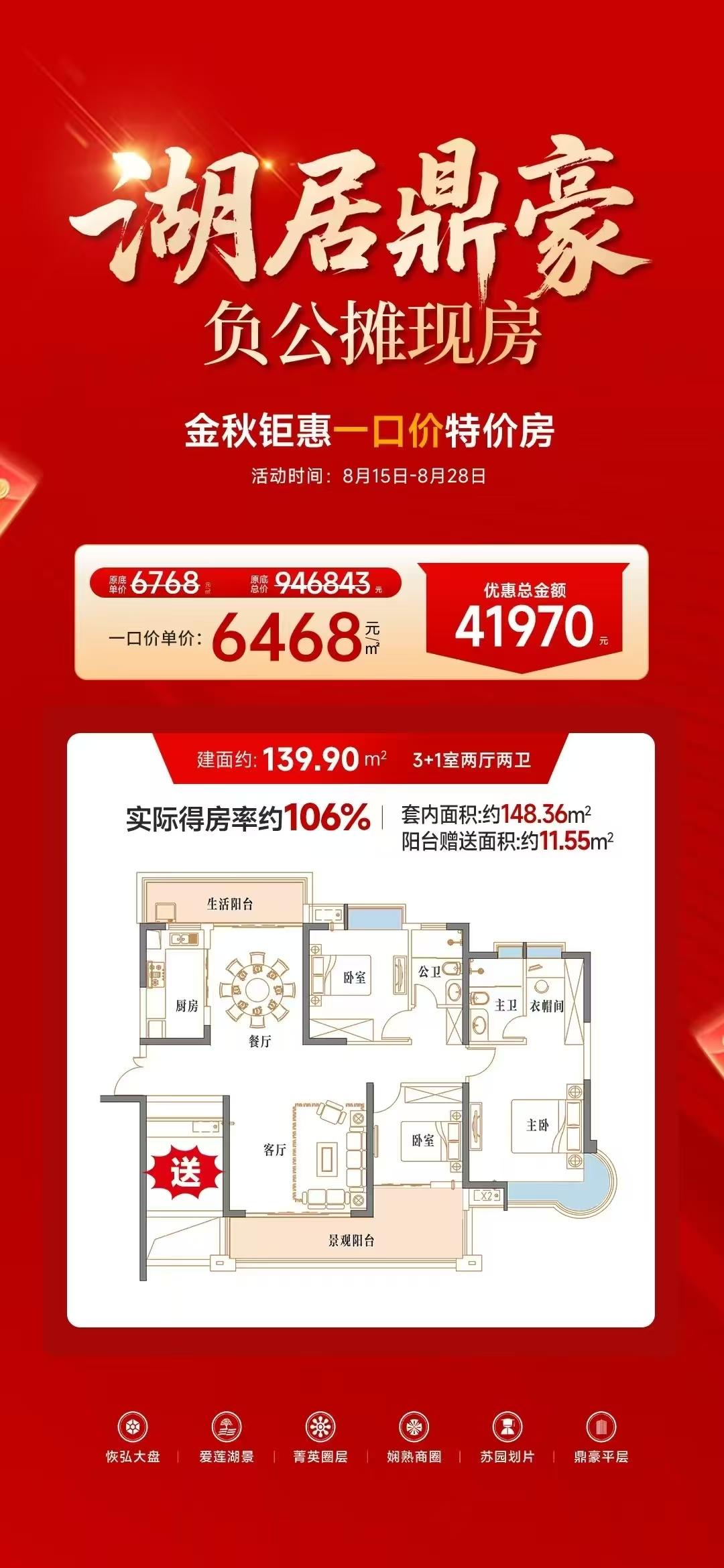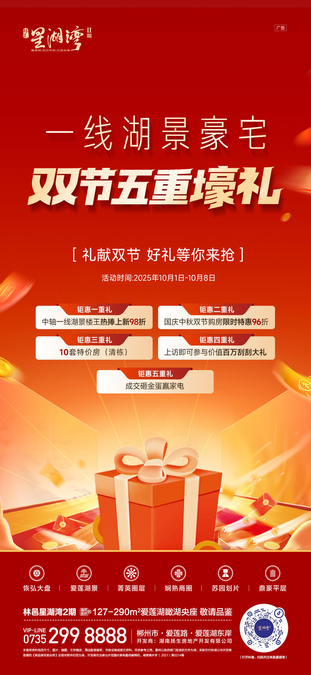 优惠政策:双节5重壕礼:1.中轴一线湖景楼王上新98折;2.国庆中秋双节购房限时特惠96折;3.10套清栋特价房;4.上访享价值百万刮刮大礼;5.成交砸金蛋赢家电。