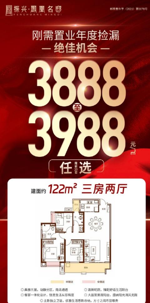 优惠政策:建面约122㎡户型,3888-3988元/㎡任选。