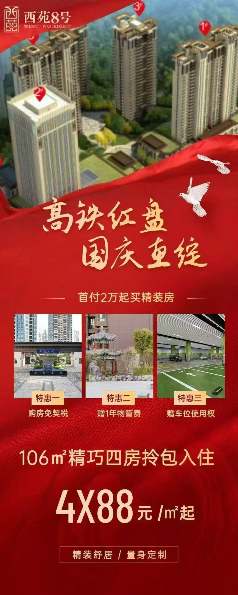 优惠政策:1.返乡客户上访凭车票报销100元;2.国庆返乡置业总房款优惠20000元;3.国庆购房送价值28000-38000元全国家具;4.购房送价值9800元全屋装修方案;5.购房加18888元送指定车位;6.契税全免(政府50%,开发商50%);7.10套一口价房源3888-3988元/㎡任选;8.砸金蛋赢精美礼品。
