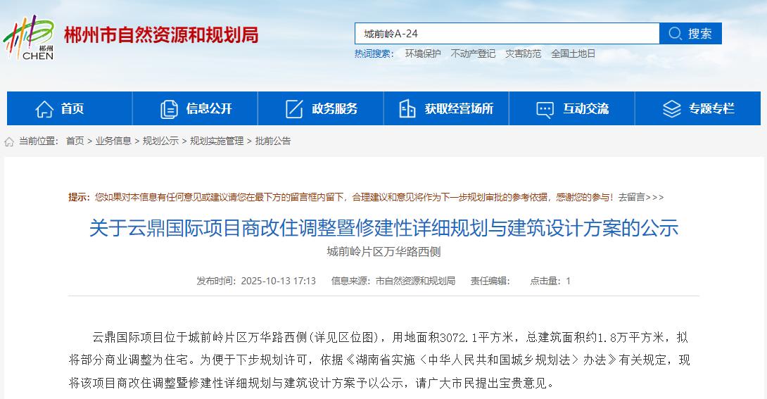 近日,郴州市自然资源和规划局发布一则《关于云鼎国际项目商改住调整暨修建性详细规划与建筑设计方案的公示》。