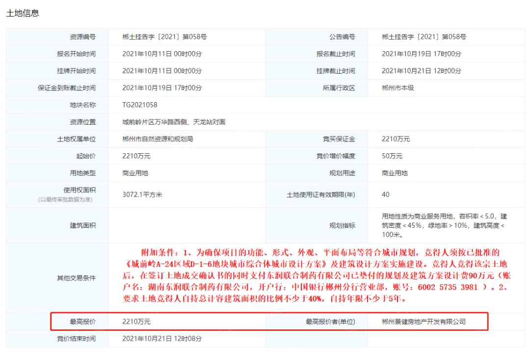 据悉,云鼎国际项目地块由郴州景健房地产开发有限公司于2021年10月以2210万元成功竞得。