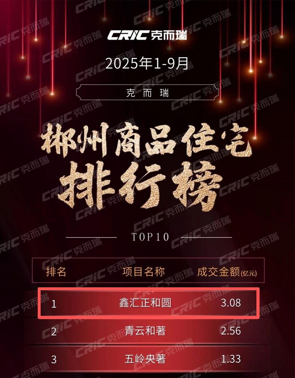 据克而瑞发布的1-9月销量榜单显示,正和圆以3.08亿元的销售额,不仅荣膺郴州销冠,更稳坐湘南地区头把交椅。