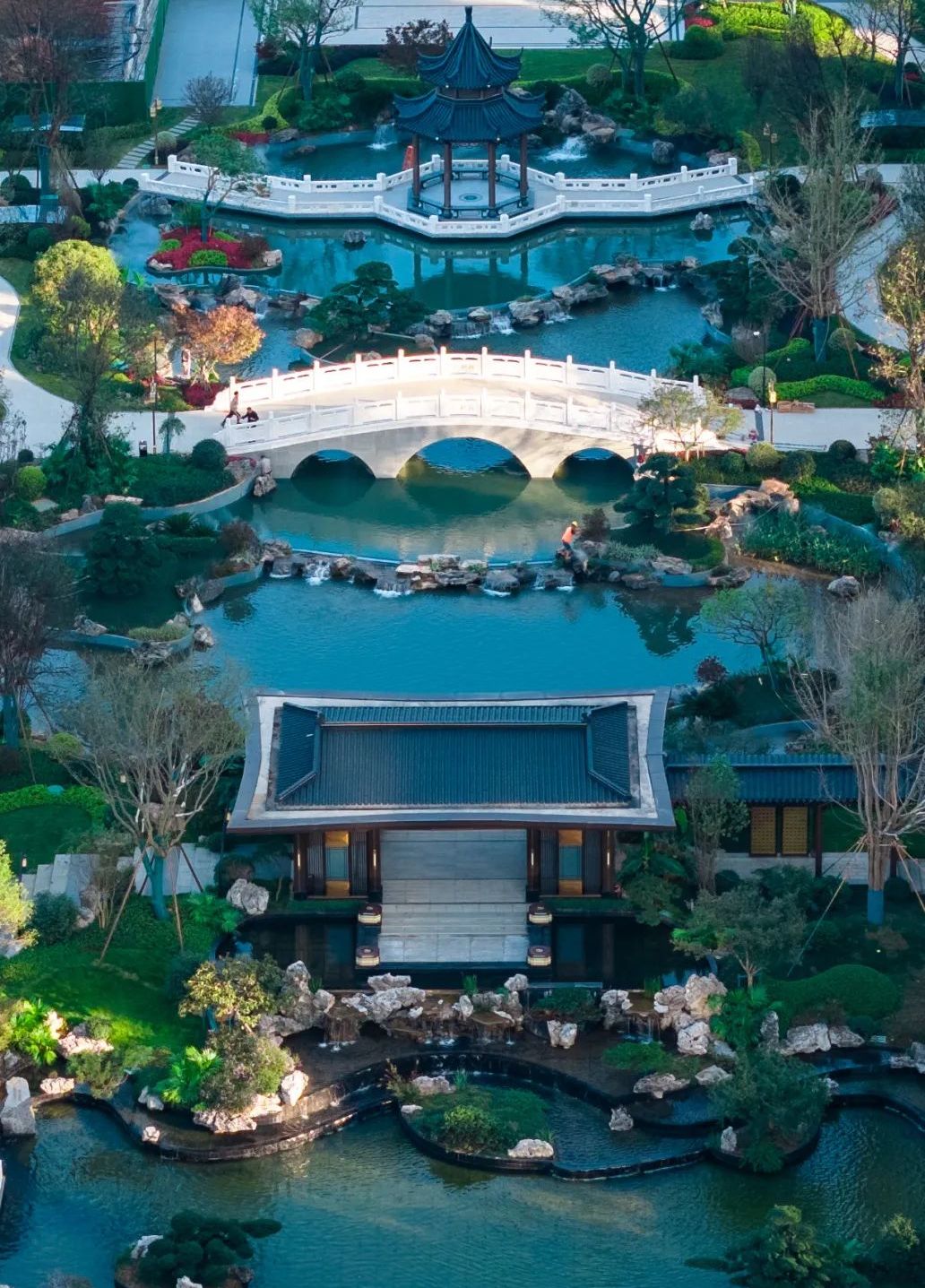 园中藏天地,取法苏州名园写意手法,通过叠山理水、遍植古木奇石,营造出“不出城郭而获山林之怡”的园林意境,让每一次归家都成为穿越东方美学的行走体验。