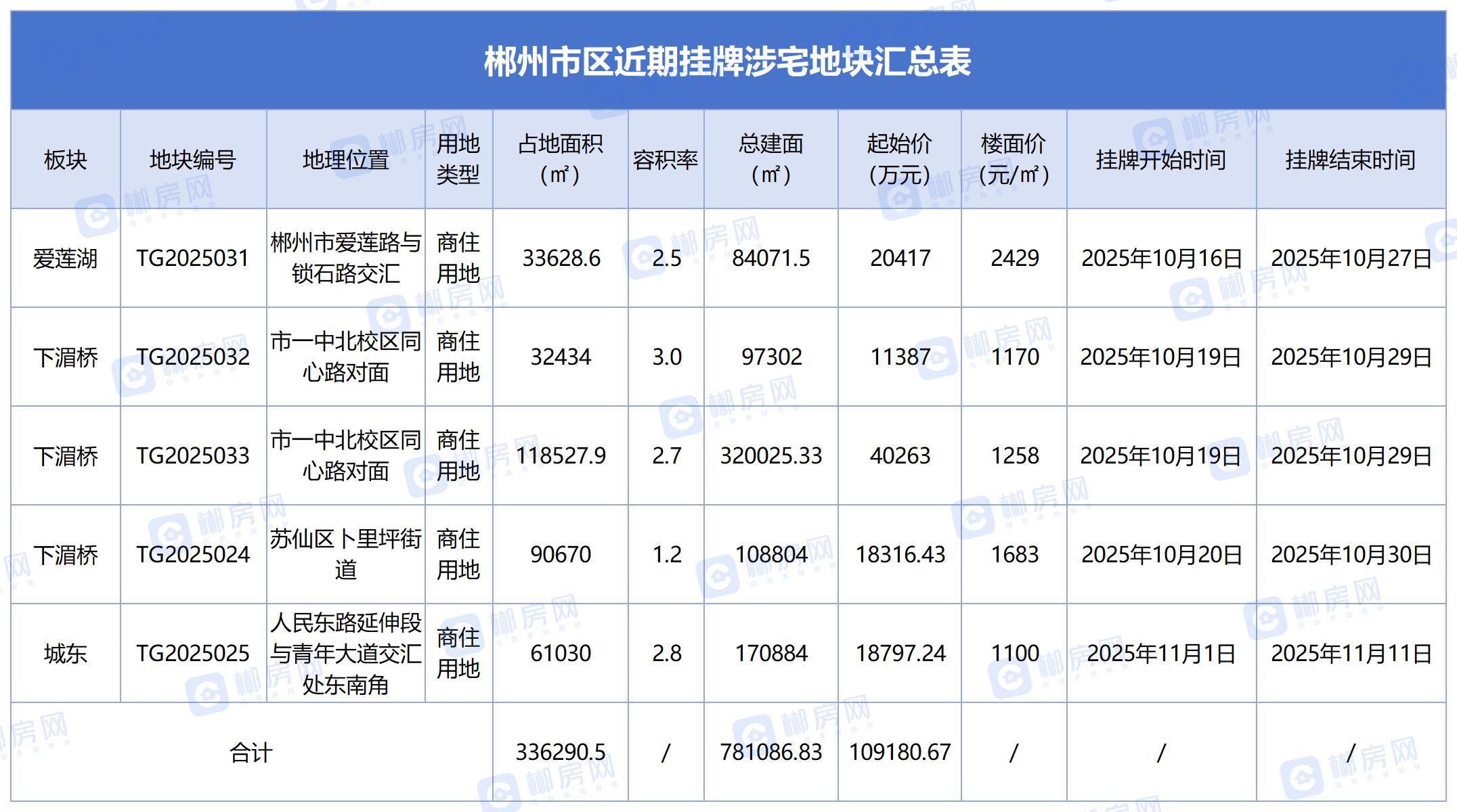 据不完全统计,10月底至11月初,郴州将有5宗涉宅地块陆续出让,总出让面积约78万㎡,挂牌起始总价约10.92亿元!