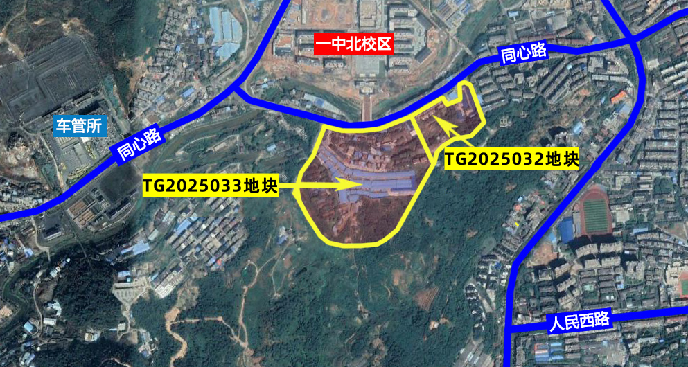紧随其后,一中北校区正对面同步推出TG2025032、TG2025033两宗连体地块,总面积150961.9㎡,起始总价51650万元,起始楼面价分别为1170元/㎡、1258元/㎡。