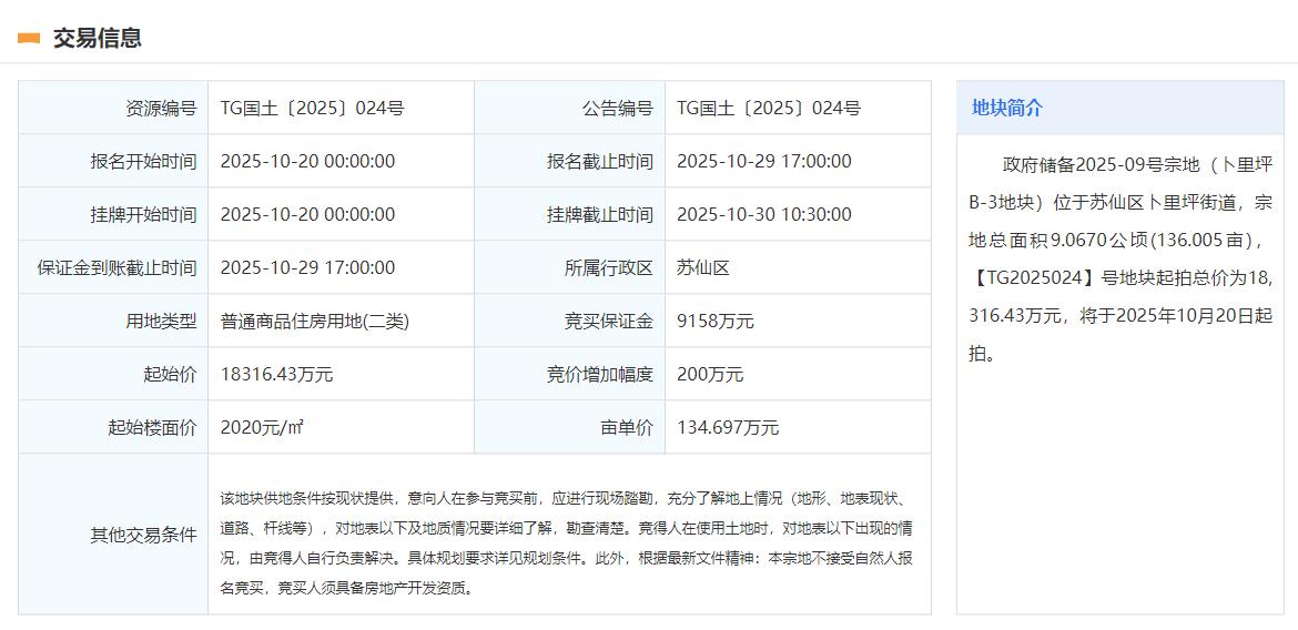 卜里坪片区推出的TG2025024地块,总面积90670㎡,起始总价18316.43万元,起始楼面价1683元/㎡。