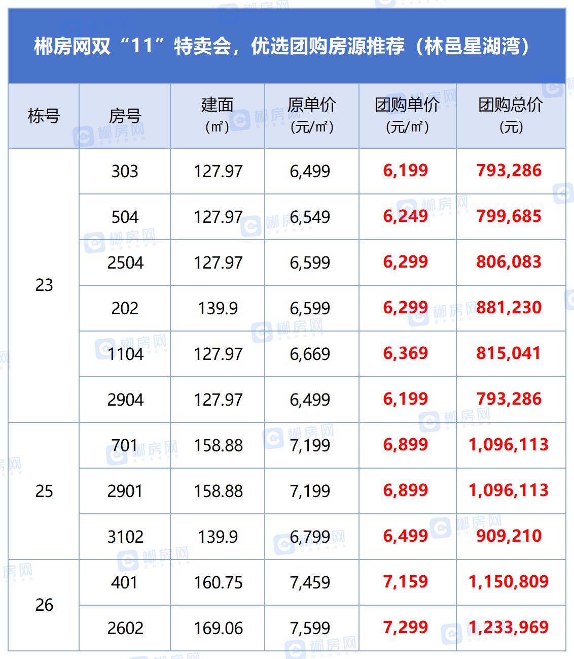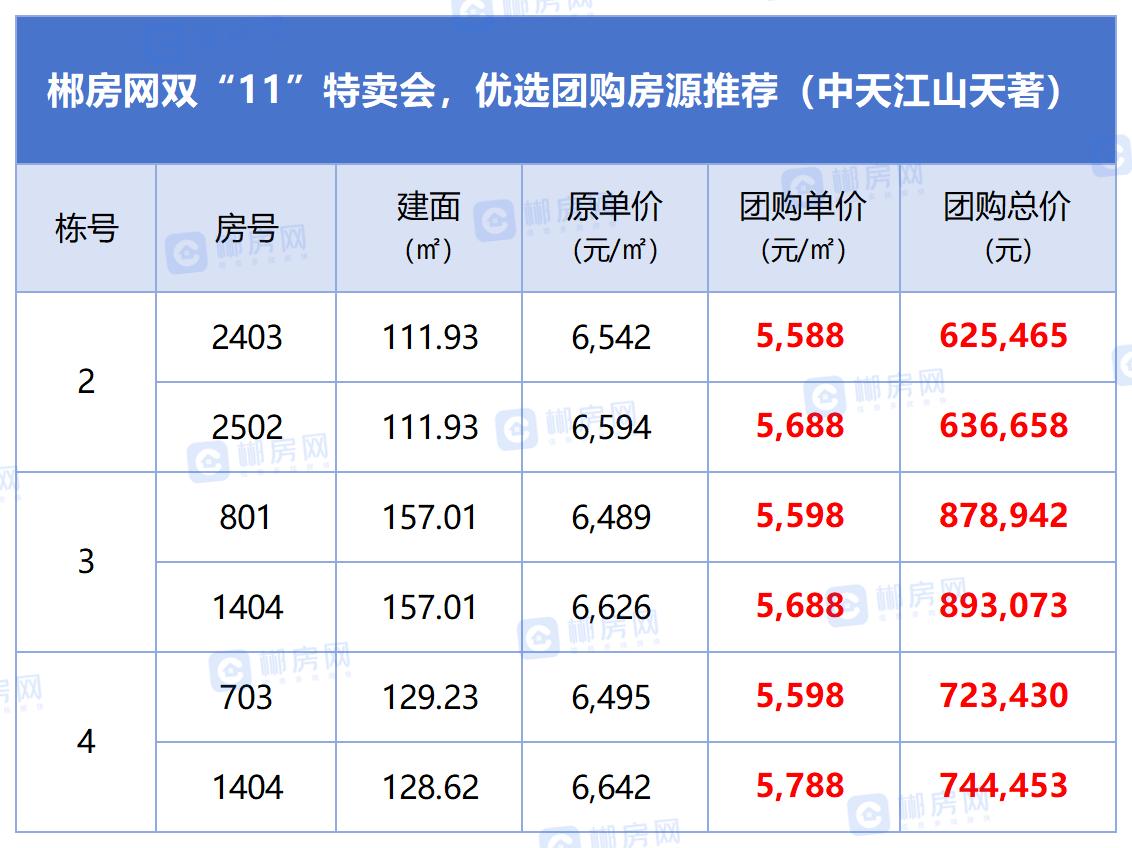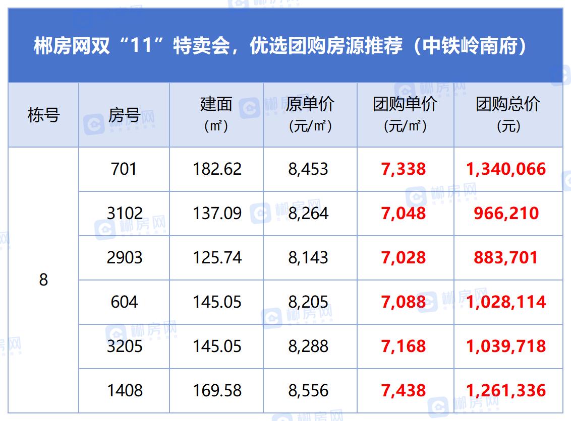 本届郴房网双十一特卖会,我们联动中铁岭南府、鑫汇正和圆、青云和著、林邑星湖湾、中天江山天著等十余个人气楼盘,推出近百套特价团购房源,单价低至3888元/㎡起,满足刚需、改善不同置业需求。