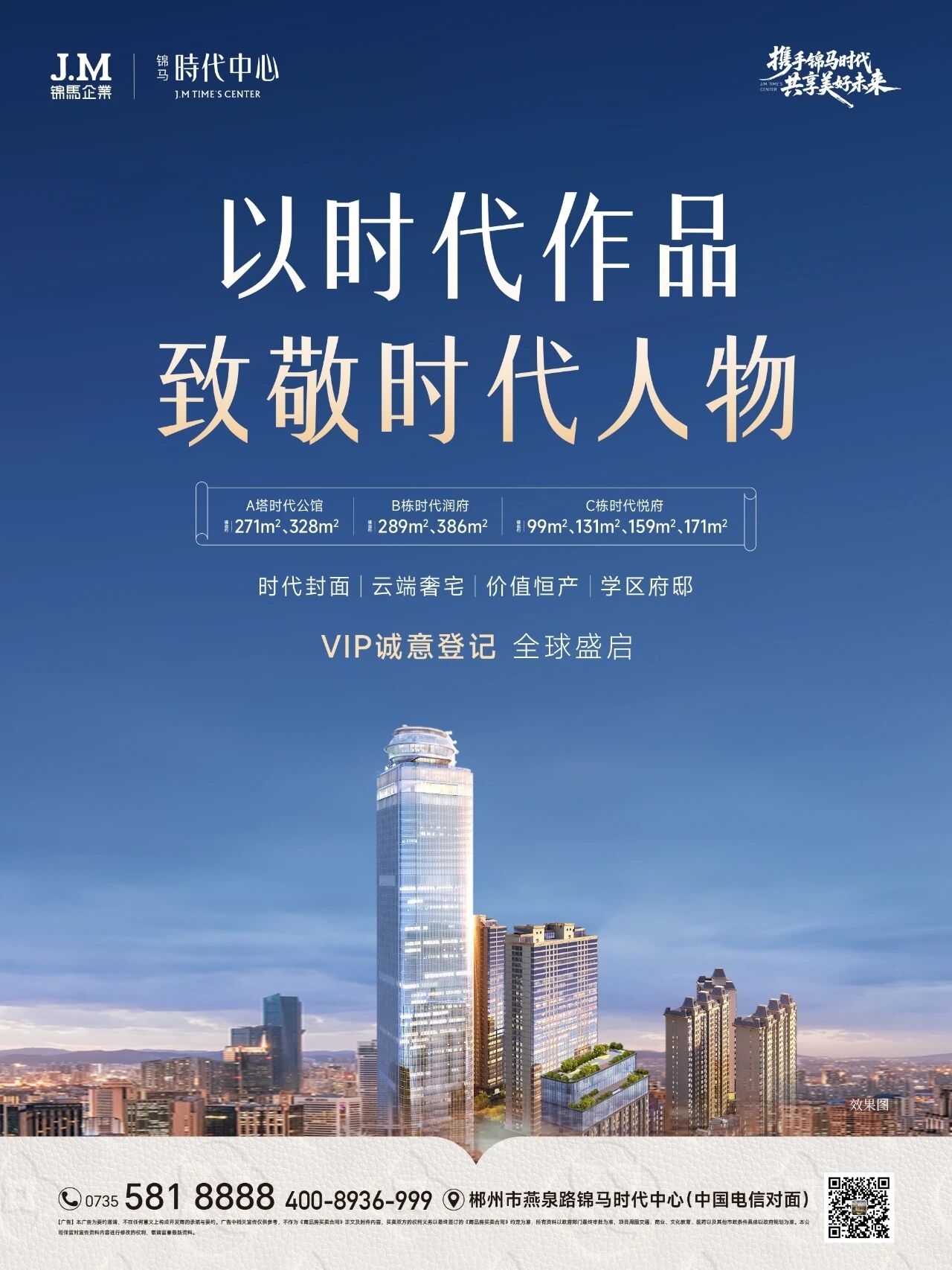 深耕郴州二十三载,以匠心致初心。锦马时代中心以一座建筑的时代力量,回应湘南粤北对城市未来的所有想象。锦马时代中心,不止是建筑,更以“高度、文旅、商业、业态、品质”五维价值,重新定义郴州城市量级的时代坐标,开启福城全新篇章。