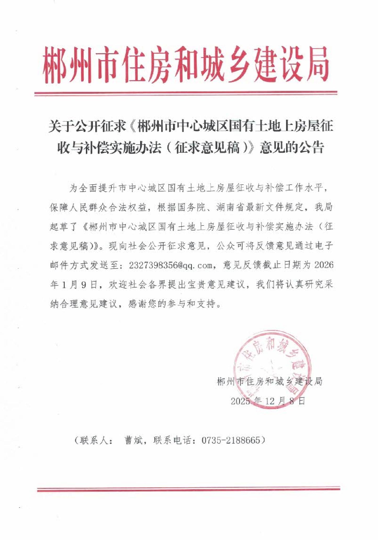 近日,郴州市就《郴州市中心城区国有土地上房屋征收与补偿实施办法(征求意见稿)》公开征求意见。